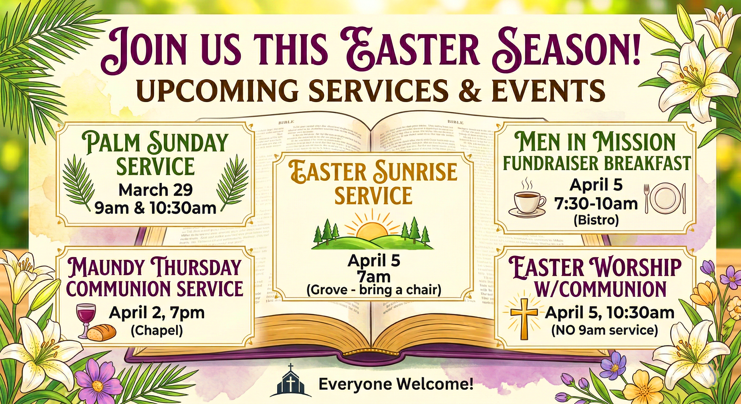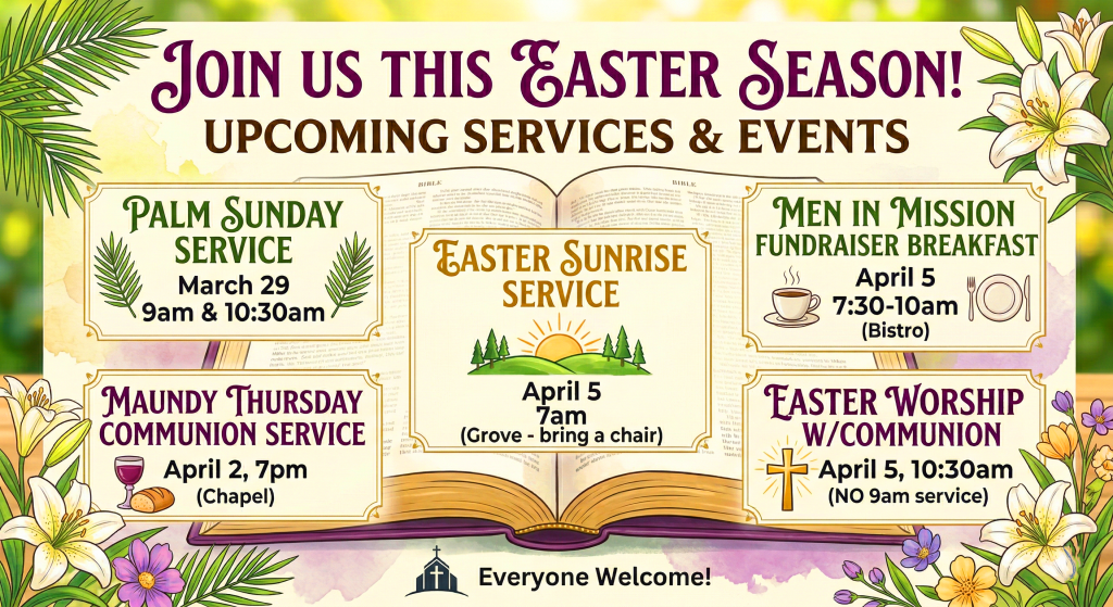 Wednesdays, 6:30 pm outdoors in The Grove or inside in our Basement Bistro and on Facebook Live. Featuring inspirational music by Jimmy Overton and musings by Pastor Mike Reaves. (We usually share in fellowship and a light meal starting around 6pm.