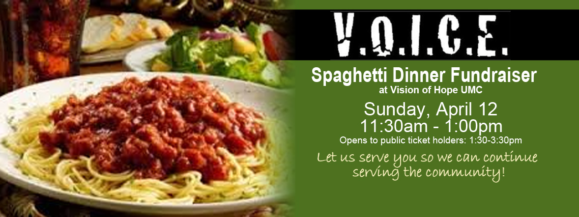 A Spaghetti Luncheon will be held Sunday, April 12, 11:30-1:00 pm in the Fellowship Hall. The proceeds will benefit the ministries of our community choir V.O.I.C.E.